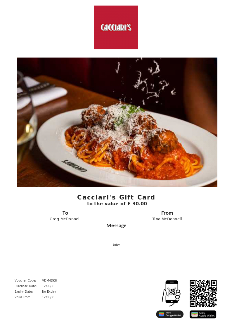 Cacciari's allows you to purchase instantly printable gift vouchers, special offers and tickets using the Voucher Connect platform.